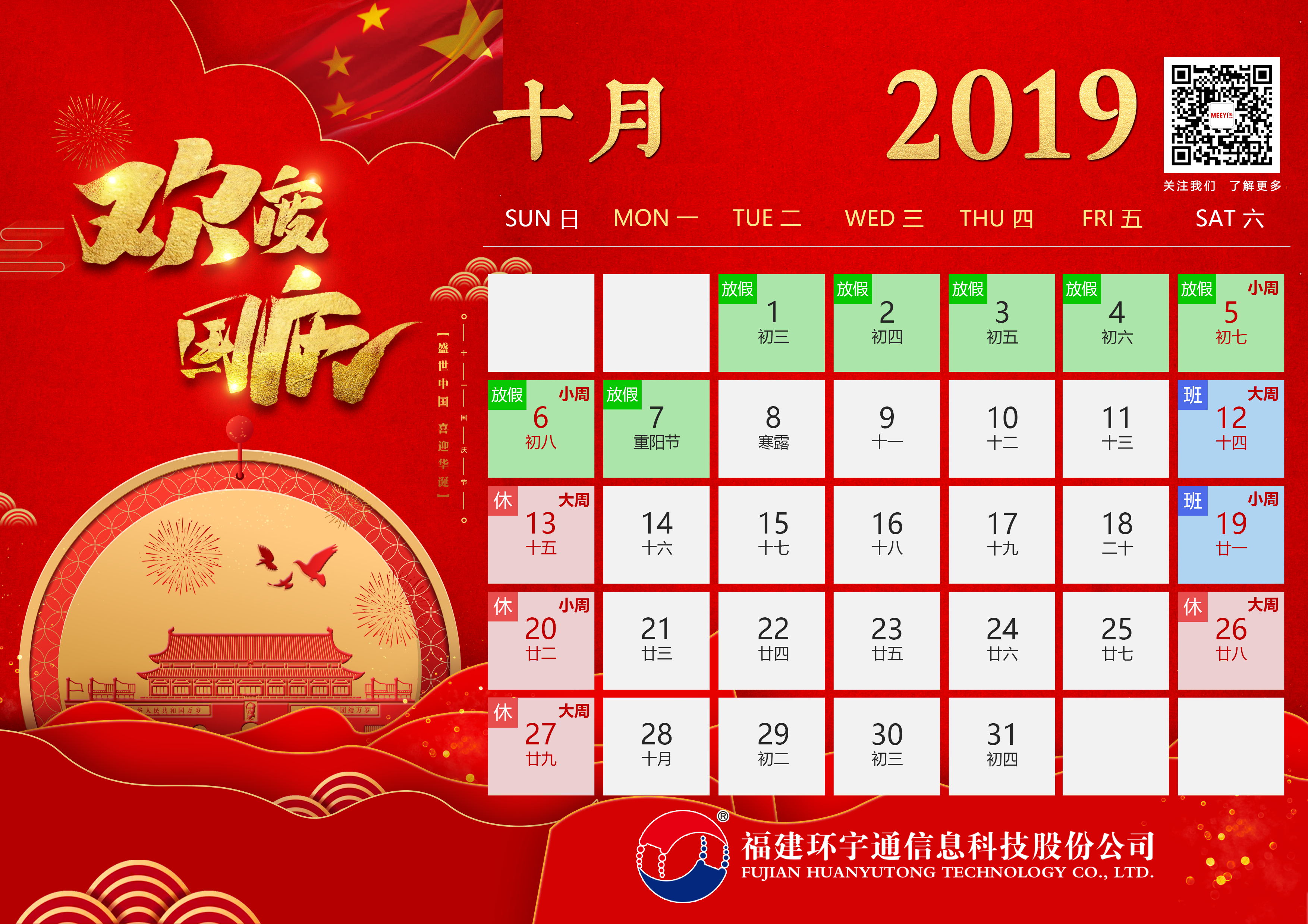 國慶佳節(jié)到來,祝愿祖國愈發(fā)繁榮富強(qiáng),平安昌盛,同時(shí)也祝愿所有同胞們節(jié)日快樂。 為響應(yīng)國家法定節(jié)假日的安排,我司決定于10.1-10.7安排休假,于10.8日正式上班,由于休假給您帶來的困擾報(bào)以萬分的歉意。