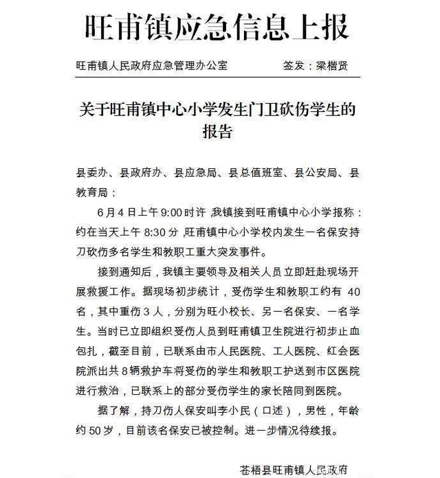 約在2020年6月4日上午8:30分,旺甫鎮(zhèn)中心小學(xué)校內(nèi)發(fā)生一名保安持刀砍傷多名學(xué)生和教職工重大突發(fā)事件。 當(dāng)日12時(shí)22分,蒼梧縣縣委宣傳部微信公號(hào)“今日蒼梧”發(fā)布通報(bào)稱,經(jīng)初步核查,受傷人數(shù)39人,其中37人輕微傷,2人傷勢(shì)稍重,已全部送往醫(yī)院救治,無(wú)生命危險(xiǎn)。 一名知情人士此前提供的一份《旺甫鎮(zhèn)應(yīng)急信息上報(bào)材料》顯示,經(jīng)初步統(tǒng)計(jì),受傷學(xué)生和教職工約有40人,其中重傷3人,分別為旺小校長(zhǎng)、另一名保安和一名學(xué)生。而持刀傷人者李某某,男性,約50歲。