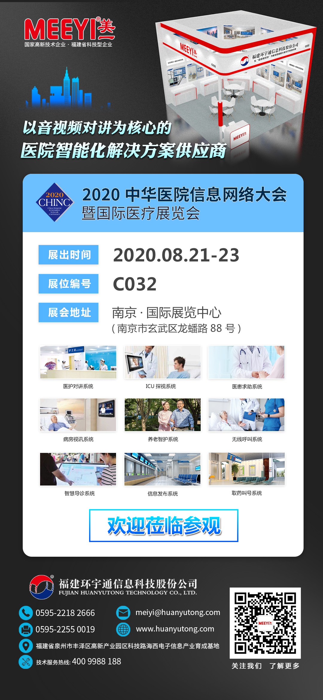 2020年8月21日,福建環(huán)宇通信息科技股份公司旗下品牌MEEYI美一將在南京國際展覽中心舉辦的中華醫(yī)院信息網(wǎng)絡(luò)大會暨中國醫(yī)療信息技術(shù)展覽上亮相。