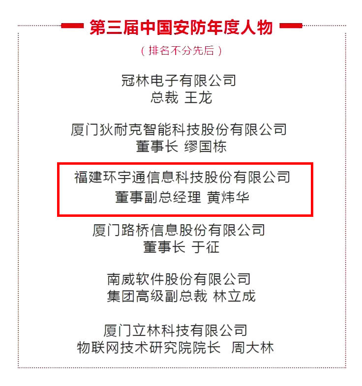 “不忘初心,方得始終”是對(duì)黃煒華從事安防行業(yè)20余年,為安防事業(yè)所做貢獻(xiàn)的真實(shí)寫照。在環(huán)宇通,黃煒華憑借著扎實(shí)的技術(shù)功底和創(chuàng)新思維,準(zhǔn)確把握行業(yè)發(fā)展方向,積極推動(dòng)研發(fā)組織與流程的變革,帶領(lǐng)團(tuán)隊(duì)攻堅(jiān)克難。不僅如此,黃煒華還親自帶隊(duì)進(jìn)行市場(chǎng)推廣,“一個(gè)不了解市場(chǎng)需求的研發(fā)團(tuán)隊(duì),怎么能創(chuàng)造出讓市場(chǎng)滿意的產(chǎn)品呢?”,他的話時(shí)刻警醒著研發(fā)、銷售人員。通過(guò)深入市場(chǎng),了解市場(chǎng)需求,制造過(guò)硬的產(chǎn)品,環(huán)宇通的產(chǎn)品和技術(shù)獲得了客戶的高度認(rèn)可。其中,黃煒華率隊(duì)研發(fā)的“一種互聯(lián)網(wǎng)+智慧社區(qū)養(yǎng)老應(yīng)急求助系統(tǒng)”的專利技術(shù),成功應(yīng)用于安防領(lǐng)域,產(chǎn)生了較大的經(jīng)濟(jì)、社會(huì)效益,為安防產(chǎn)業(yè)的發(fā)展作出了突出貢獻(xiàn)。科研的道路上要的是自力更生、艱苦奮斗、勇攀科研高峰的決心、毅力與堅(jiān)持。黃煒華不忘初心的實(shí)干與奮斗,始終是最為鮮亮的底色。● 2020年 獲“第三屆中國(guó)安防年度人物”榮譽(yù)稱號(hào)