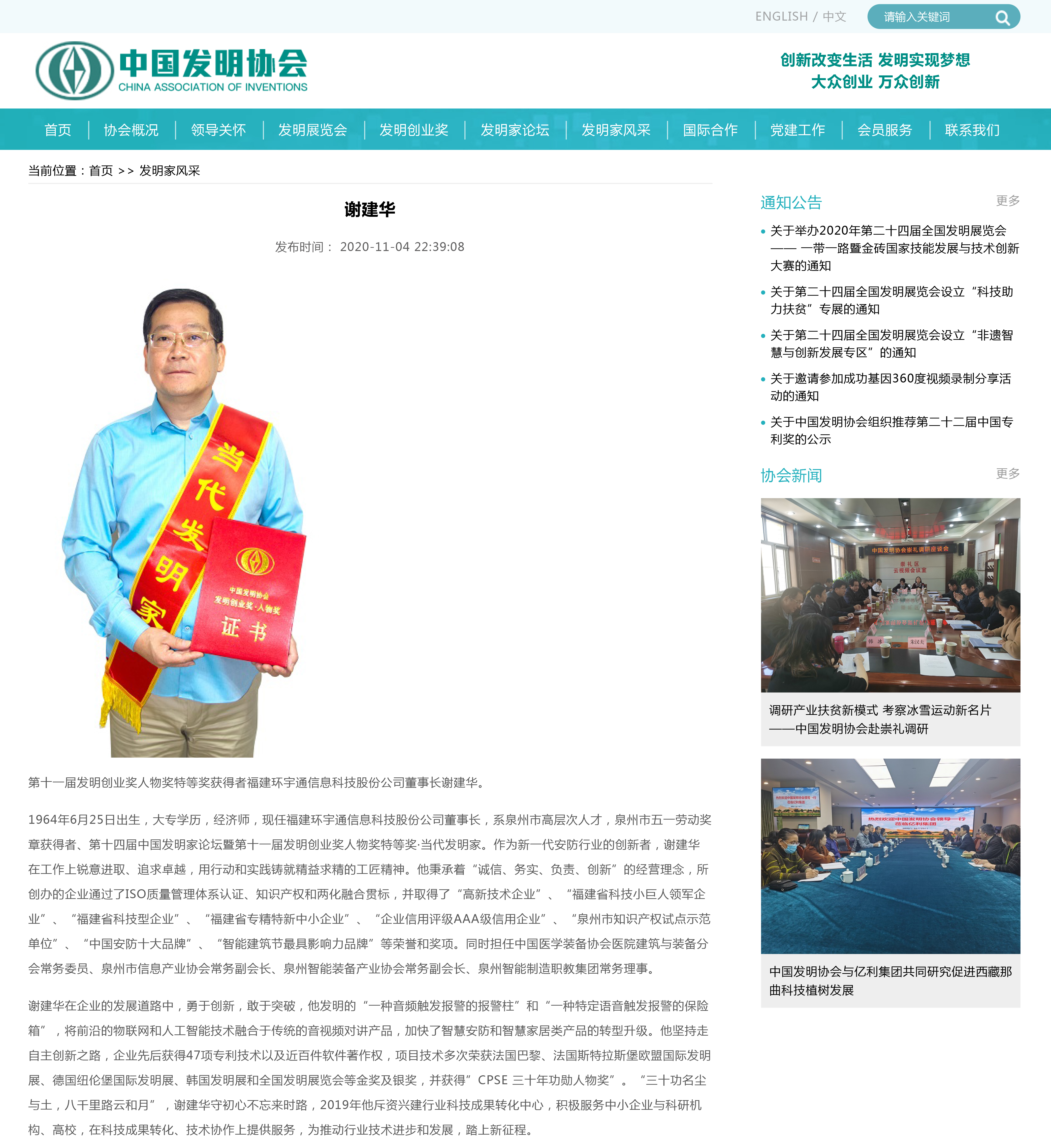 第十一屆發(fā)明創(chuàng)業(yè)獎(jiǎng)人物獎(jiǎng)特等獎(jiǎng)獲得者福建環(huán)宇通信息科技股份公司董事長(zhǎng)謝建華。 1964年6月25日出生,大專(zhuān)學(xué)歷,經(jīng)濟(jì)師,現(xiàn)任福建環(huán)宇通信息科技股份公司董事長(zhǎng),系泉州市高層次人才,泉州市五一勞動(dòng)獎(jiǎng)?wù)芦@得者、第十四屆中國(guó)發(fā)明家論壇暨第十一屆發(fā)明創(chuàng)業(yè)獎(jiǎng)人物獎(jiǎng)特等獎(jiǎng)·當(dāng)代發(fā)明家。作為新一代安防行業(yè)的創(chuàng)新者,謝建華在工作上銳意進(jìn)取、追求卓越,用行動(dòng)和實(shí)踐鑄就精益求精的工匠精神。他秉承著“誠(chéng)信、務(wù)實(shí)、負(fù)責(zé)、創(chuàng)新”的經(jīng)營(yíng)理念,所創(chuàng)辦的企業(yè)通過(guò)了ISO質(zhì)量管理體系認(rèn)證、知識(shí)產(chǎn)權(quán)和兩化融合貫標(biāo),并取得了“高新技術(shù)企業(yè)”、“福建省科技小巨人領(lǐng)軍企業(yè)”、“福建省科技型企業(yè)”、“福建省專(zhuān)精特新中小企業(yè)”、“企業(yè)信用評(píng)級(jí)AAA級(jí)信用企業(yè)”、“泉州市知識(shí)產(chǎn)權(quán)試點(diǎn)示范單位”、“中國(guó)安防十大品牌”、“智能建筑節(jié)最具影響力品牌”等榮譽(yù)和獎(jiǎng)項(xiàng)。同時(shí)擔(dān)任中國(guó)醫(yī)學(xué)裝備協(xié)會(huì)醫(yī)院建筑與裝備分會(huì)常務(wù)委員、泉州市信息產(chǎn)業(yè)協(xié)會(huì)常務(wù)副會(huì)長(zhǎng)、泉州智能裝備產(chǎn)業(yè)協(xié)會(huì)常務(wù)副會(huì)長(zhǎng)、泉州智能制造職教集團(tuán)常務(wù)理事。