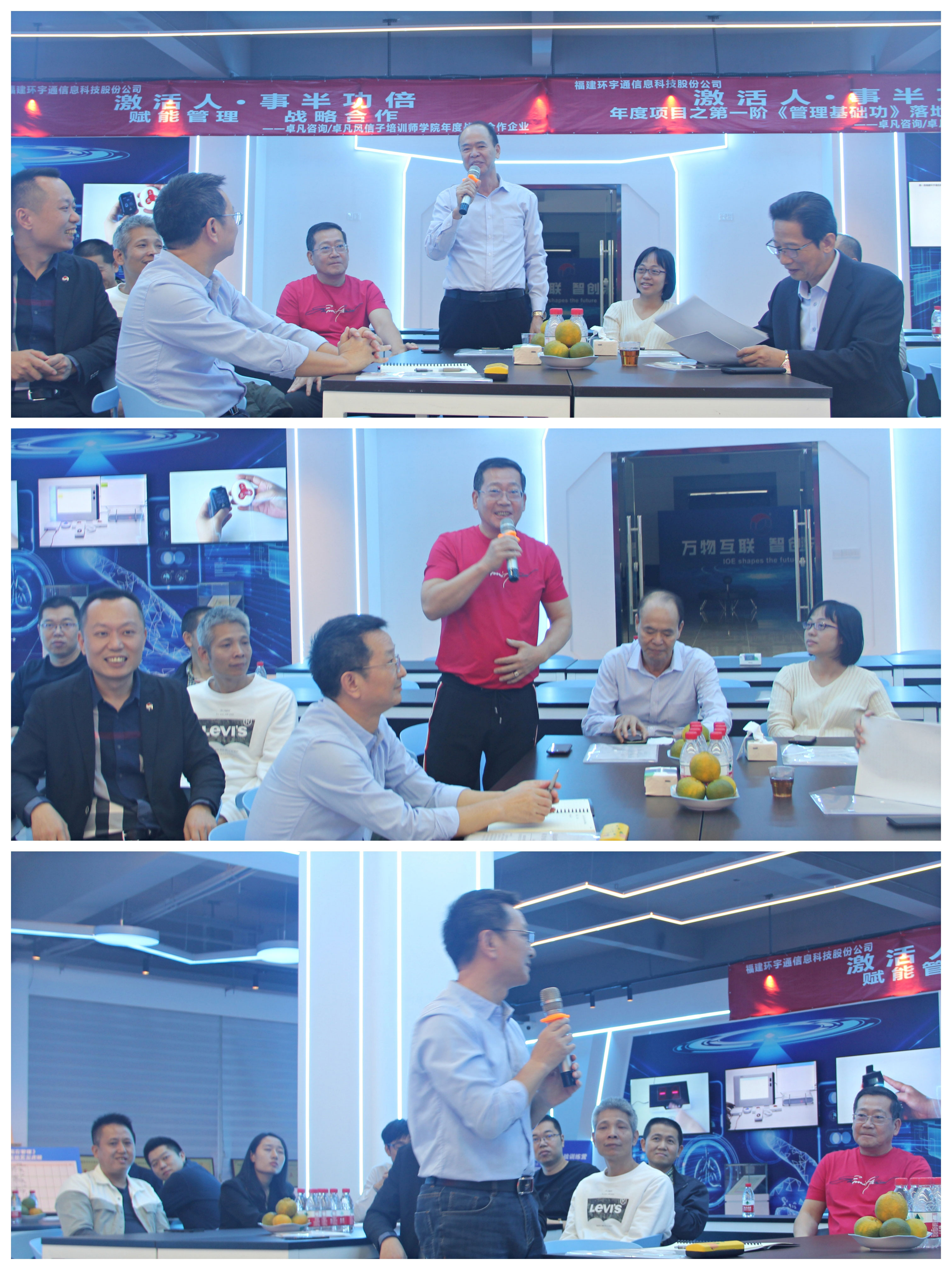 作為常務(wù)副會長單位,福建環(huán)宇通信息科技股份公司歷來備受行業(yè)、協(xié)會的高度關(guān)注。活動伊始,大家在謝建華董事長引領(lǐng)下先參觀了環(huán)宇通公司一樓產(chǎn)品展示體驗廳;隨后齊聚一樓展示廳舉行座談交流會。