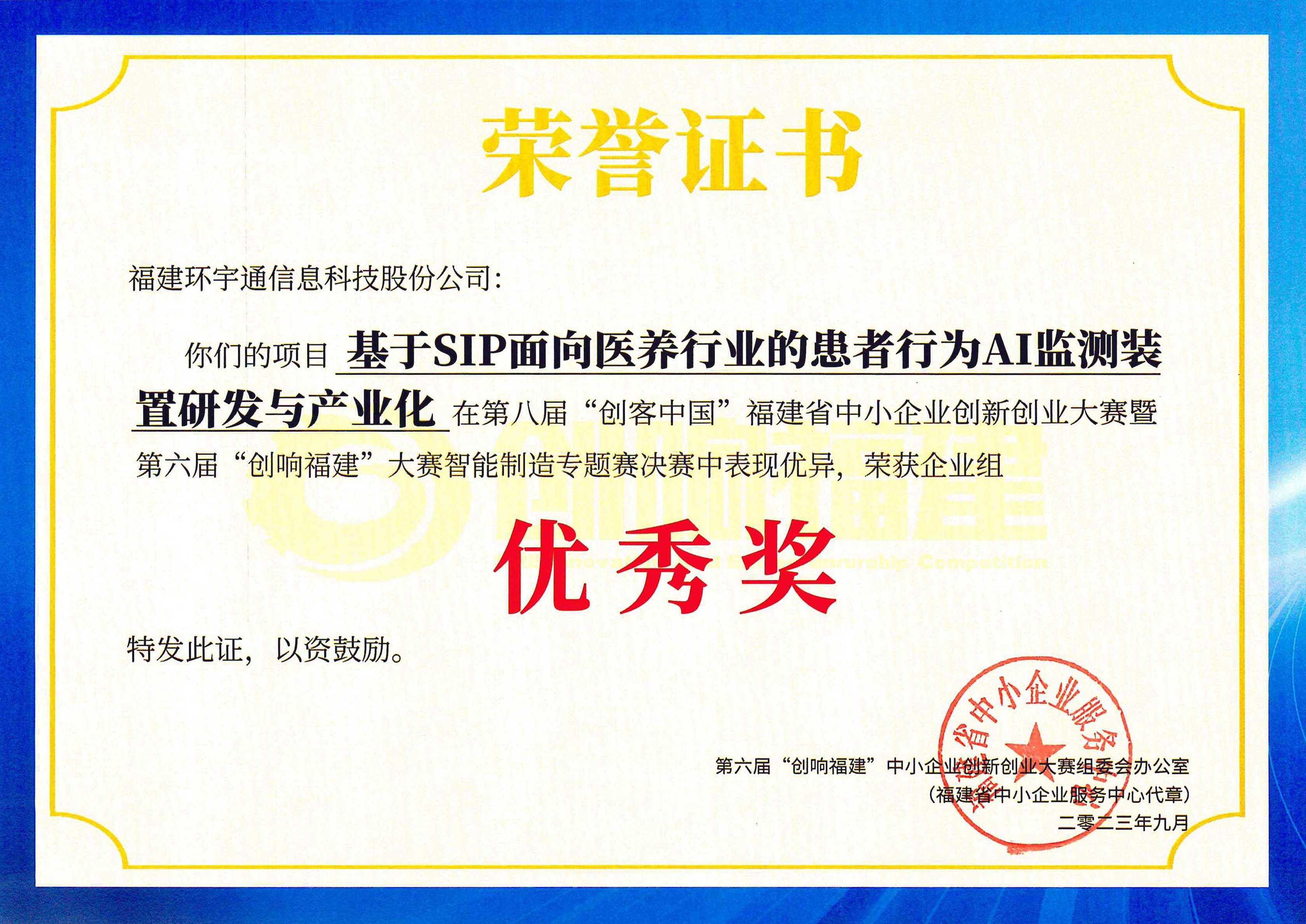 我司自主研發(fā)的“基于SIP面向醫(yī)養(yǎng)行業(yè)的患者監(jiān)測(cè)AI檢測(cè)裝置研發(fā)與產(chǎn)業(yè)化”高新項(xiàng)目,參加第六屆“創(chuàng)響福建”中小企業(yè)創(chuàng)新創(chuàng)業(yè)大賽暨第六屆“創(chuàng)響福建”大賽智能制造專(zhuān)題賽榮獲省級(jí)優(yōu)秀獎(jiǎng)。